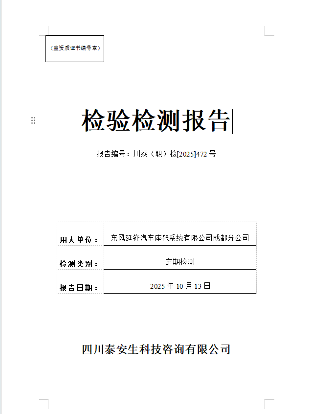 東風(fēng)延鋒汽車座艙系統(tǒng)有限公司成都分公司—川泰(職)檢[2025]472號